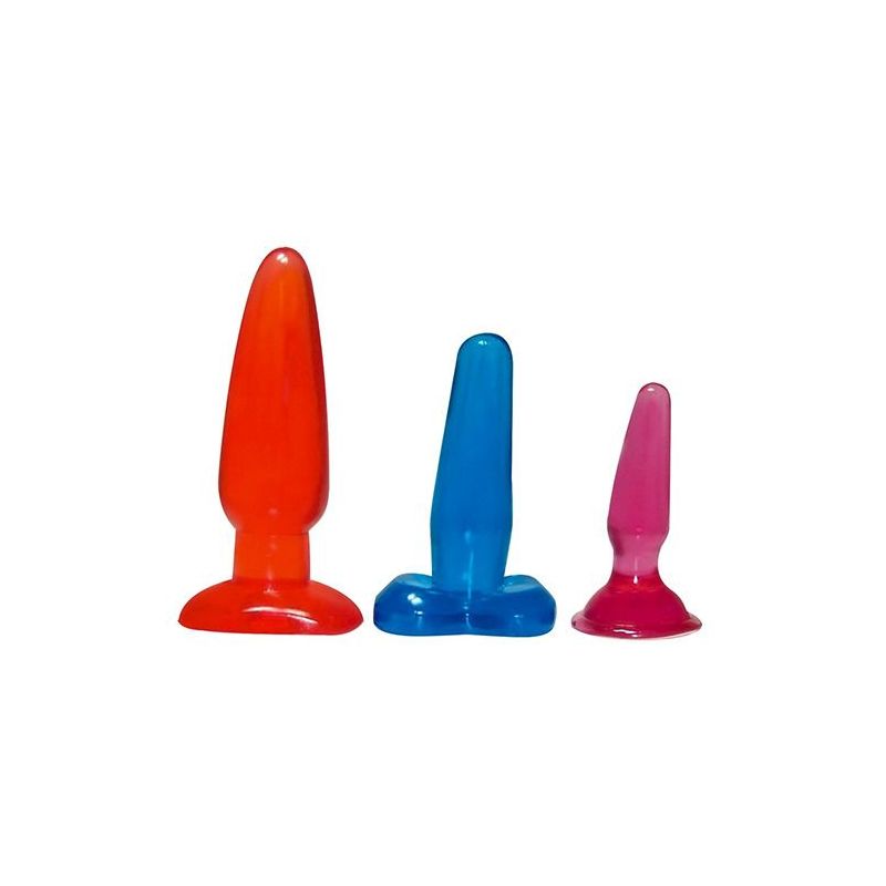 Fantastico set ideato per il tuo piacere anale in ogni sua intensita' e colore! 3 plug in jelly dalla superficie ultra liscia e scivolosa e dall'aroma fruttato che risvegliera' i tuoi sensi regalandoti penetrazioni anali all'insegna del confort e del godimento estremo! Ogni esigenza sara' appagata, sia per i principianti che per gli amanti delle pratiche piu' estreme. Il kit contiene: il plug rosso, al sapore di fragola, ideale per i piu' esigenti, lungo 15,5 cm con un diametro che va da 2 a 4,5 cm. Il plug di medie dimensioni e' blu ed ha l'aroma di mirtillo, e'lungo 12,5 cm ed ha un diametro di 2,5-3,5 cm. Il piu' piccolo e' in tinta fucsia, all'aroma di uva, ha una lunghezza di 10 cm ed un diametro di 1,5-2,5 cm. Tutti possiedono una potente ventosa alla base per essere ancorati alle superfici liscie e farti giocare con loro a mani libere! Per l'utilizzo si consiglia l'associazione ad un lubrificante anale.